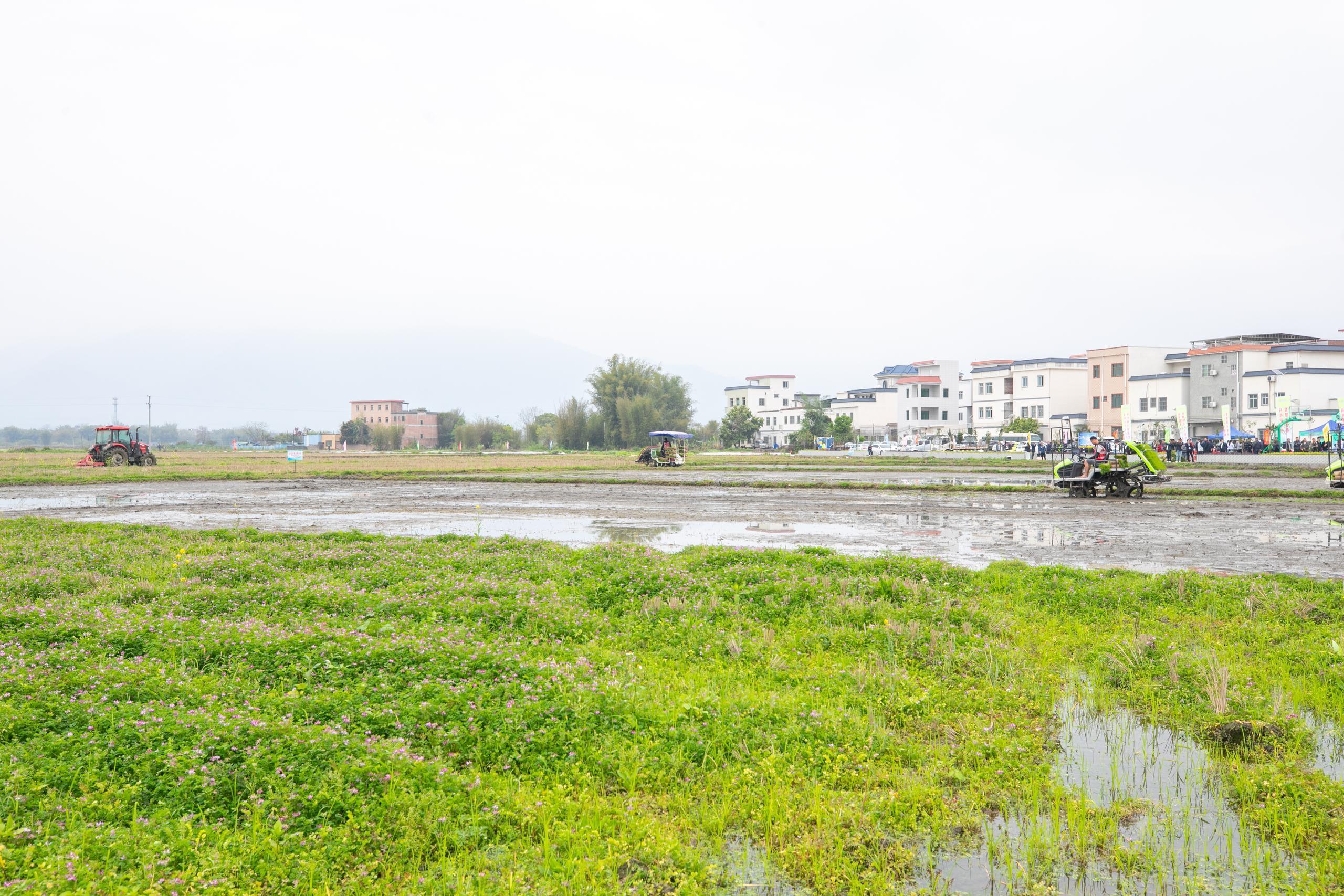 水稻田里,多台履带自走式旋耕机往来作业,植保无人机在稻田上空轰鸣。农机手驾驶着拖拉机熟练地将紫云英翻耕入土,为接下来的水稻种植积蓄地力。