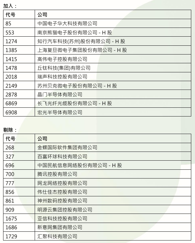 此外,恒生半导体产业主题指数成份股数目将从45只减少至33只,加入中电华大科技(00085)、贝克微(02149)等11只股票;剔除中国民航信息网络(00696)、腾讯控股(00700)等23只股票。